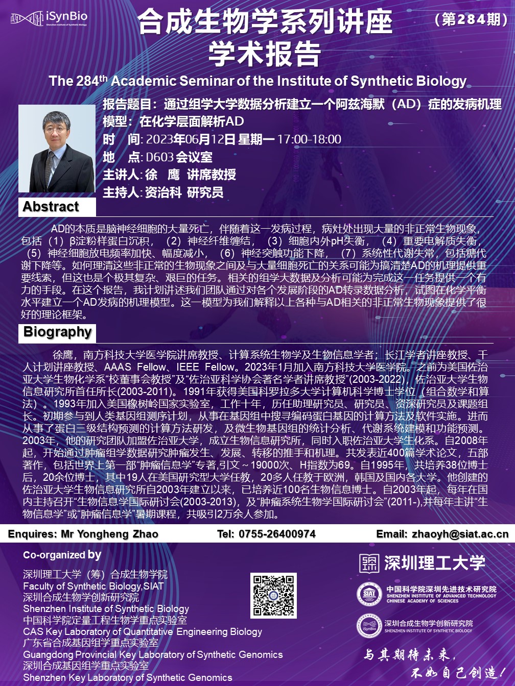 本次讲座邀请了 南方科技大学 徐鹰 教授 带来题为“通过组学大学数据分析建立一个阿兹海默(AD)症的发病机理模型:在化学层面解析AD”的报告。
