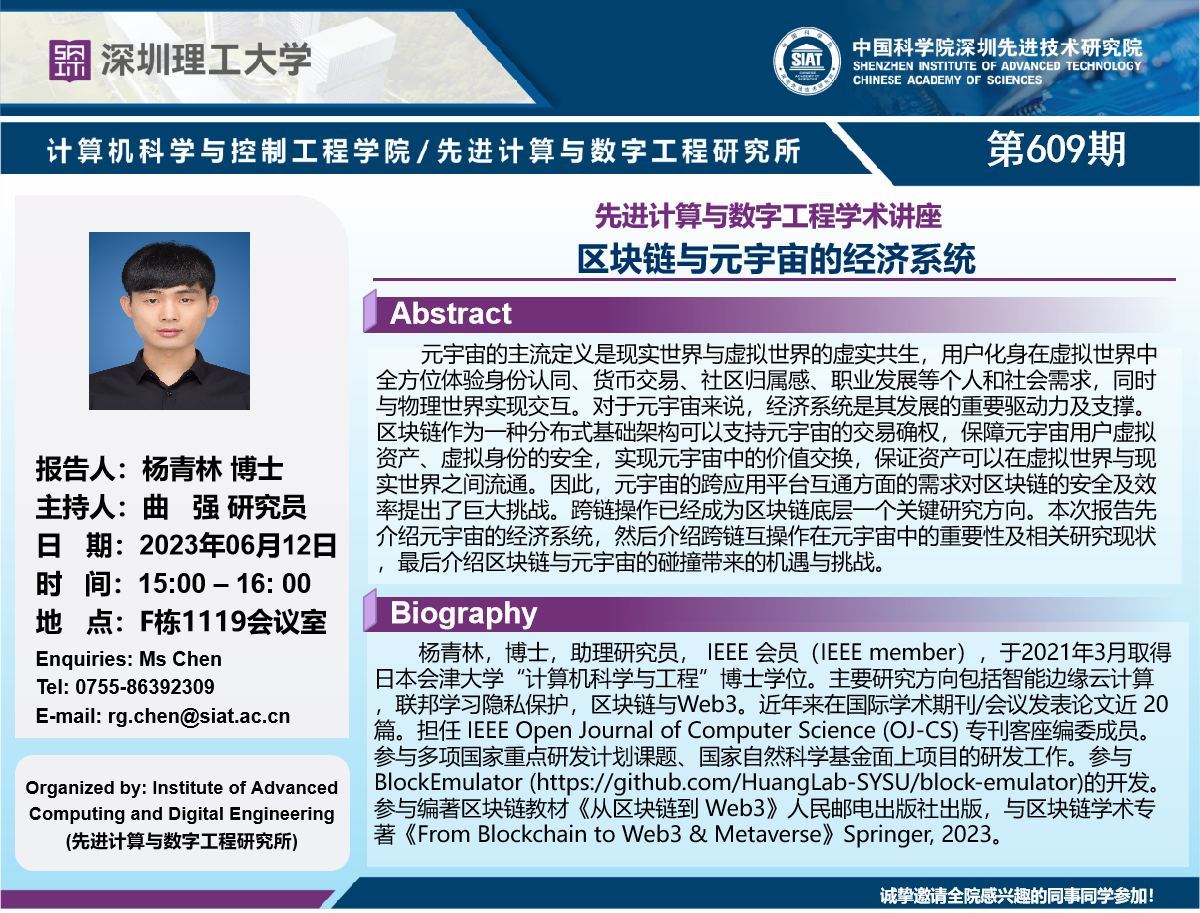 大家好!计算机学院/先进计算与数字工程研究所学术讲座第609期将于6月12日15:00-16:00在F栋1119会议室举行,本次讲座将邀请中山大学 杨青林 博士作题为“区块链与元宇宙的经济系统”的报告。本次报告将由数字所 曲强 副研究员主持,诚挚邀请大家参加、学习和交流!