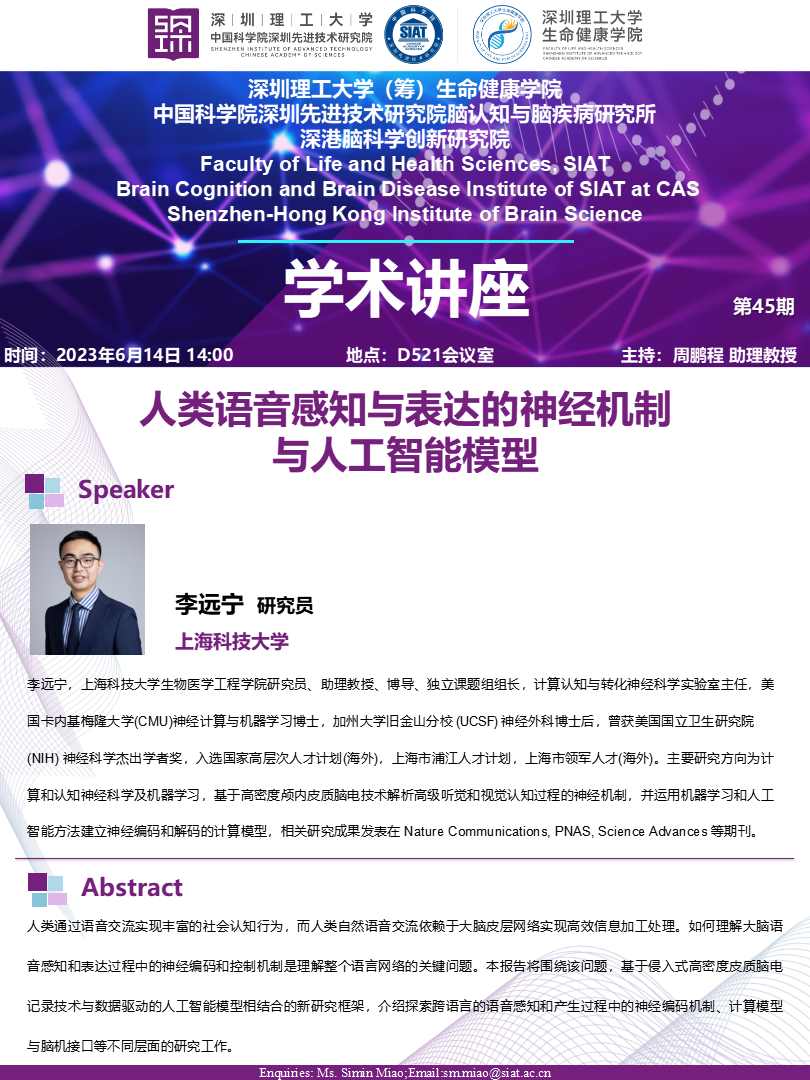 生命健康学院、脑所将于2023年6月14日14:00,地点:D521会议室 举办第45期学术讲座。