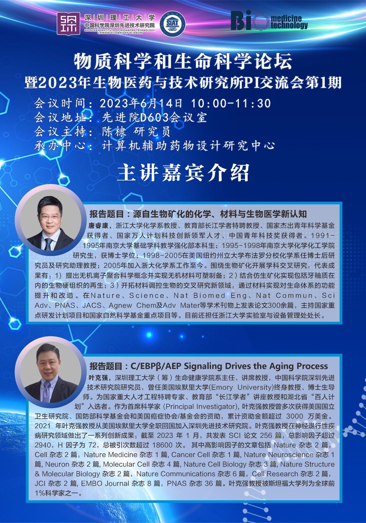 医药所物质科学与生命科学论坛—暨2023年生物医药与技术研究所PI交流会第1期将于2023年6月14日 星期三 10:00-11:30 在先进院D603会议室举行。本次讲座邀请了来自浙江大学唐睿康教授、深圳理工大学(筹)叶克强教授主讲,届时陈棣 研究员主持讲座。