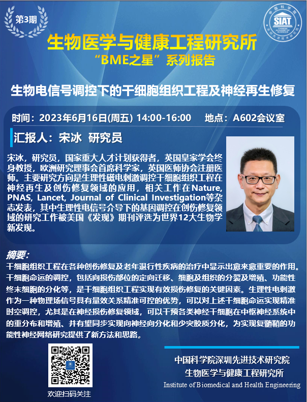 届时,宋冰 研究员将为大家带来题为“生物电信号调控下的干细胞组织工程及神经再生修复”的报告。