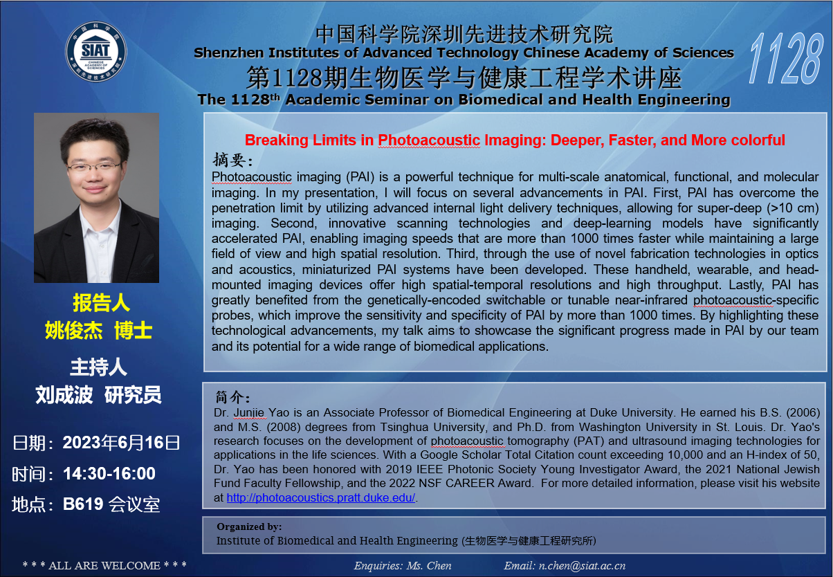 本次讲座邀请了 杜克大学 姚俊杰 博士 带来题为“Breaking Limits in Photoacoustic Imaging: Deeper, Faster, and More colorful”的报告。