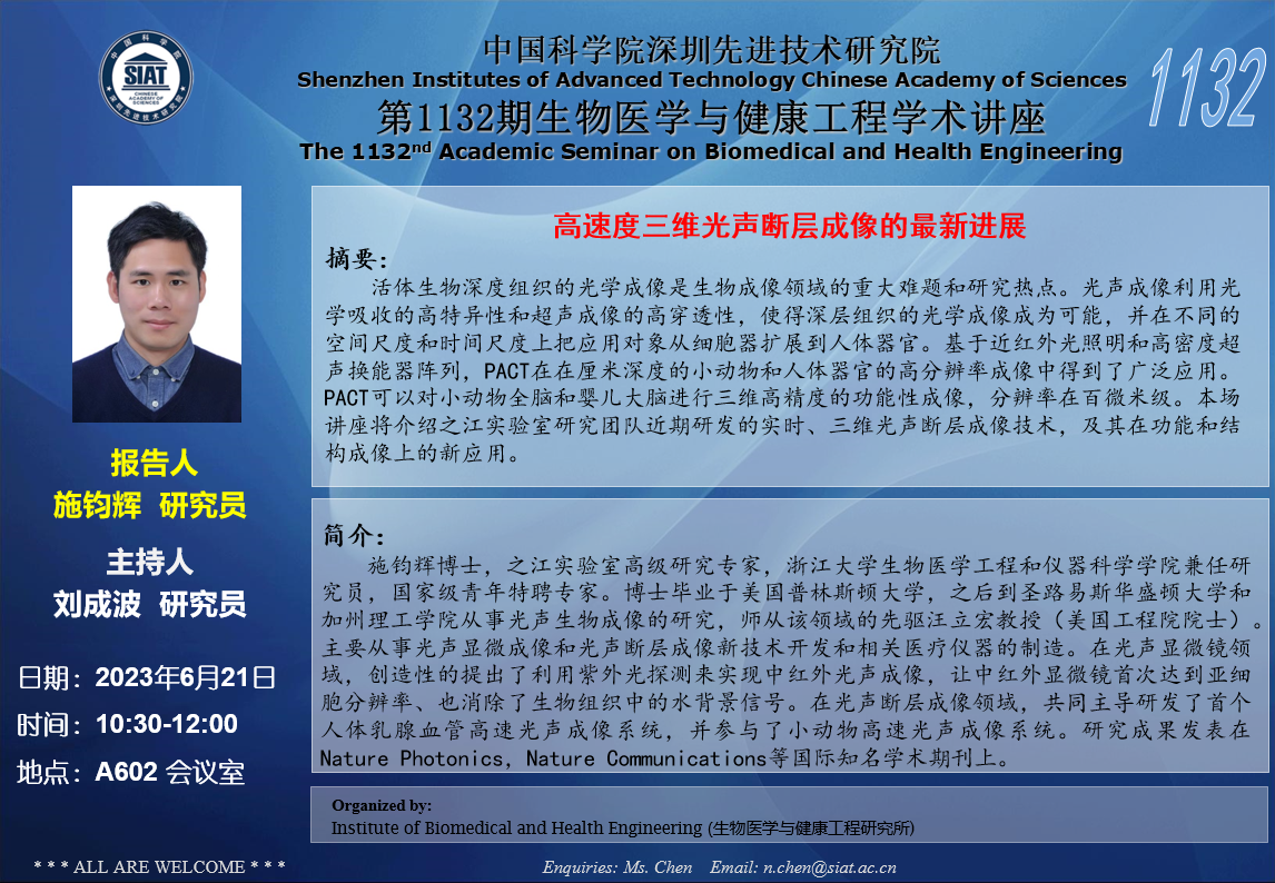 本次讲座邀请了 之江实验室 施钧辉 研究员 带来题为“高速度三维光声断层成像的最新进展”的报告。