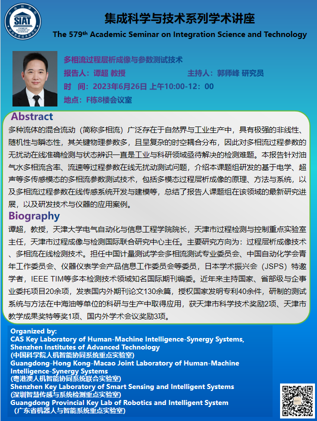 大家好! 集成所第579期集成科学与技术系列学术讲座将于2023年6月26日(周一)上午10:00-12:00于F栋8楼会议室召开,本次讲座特邀天津大学的谭超 教授作题为《多相流过程层析成像与参数测试技术》的学术报告。 会议由智能仿生研究中心的郭师峰 研究员主持,诚挚邀请大家准时参加、学习和交流! 讲座具体信息如下: