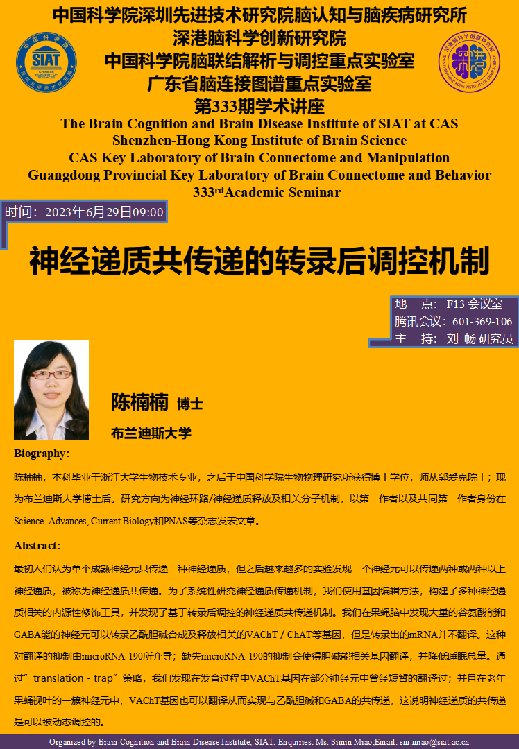 脑认知与脑疾病研究所将于2023年6月29日09:00,举办第333期学术讲座。