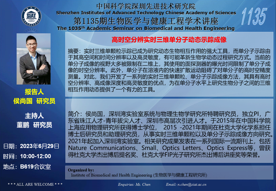 本次讲座邀请了 深圳湾实验室 侯尚国 研究员 带来题为“高时空分辨实时三维单分子动态示踪成像”的报告。