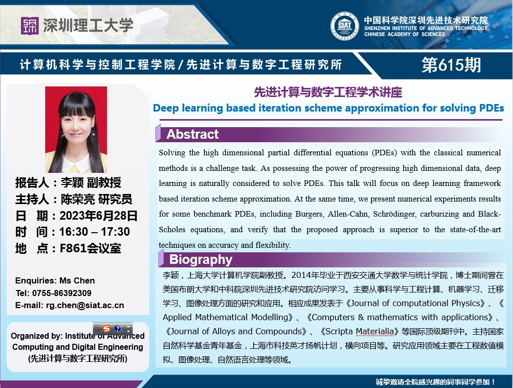 大家好!计算机学院/先进计算与数字工程研究所学术讲座第615期将于6月28日16:30-17:30在F861会议室举行。本次讲座将邀请 上海大学计算机学院 李颖 副教授 作题为“Deep learning based iteration scheme approximation for solving PDEs”的报告。本次报告将由数字所 陈荣亮 研究员主持,诚挚邀请大家参加、学习和交流!