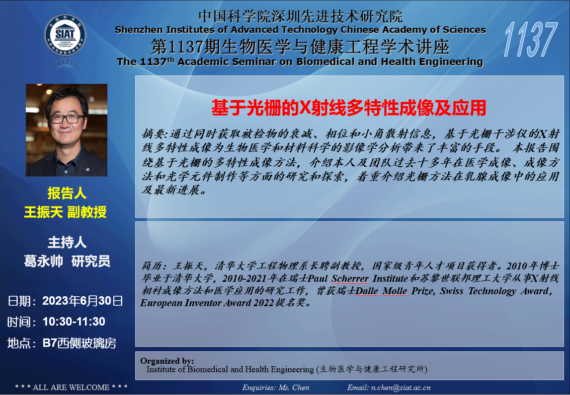 本次讲座邀请了 清华大学 王振天 副教授 带来题为“基于光栅的X射线多特性成像及应用”的报告。