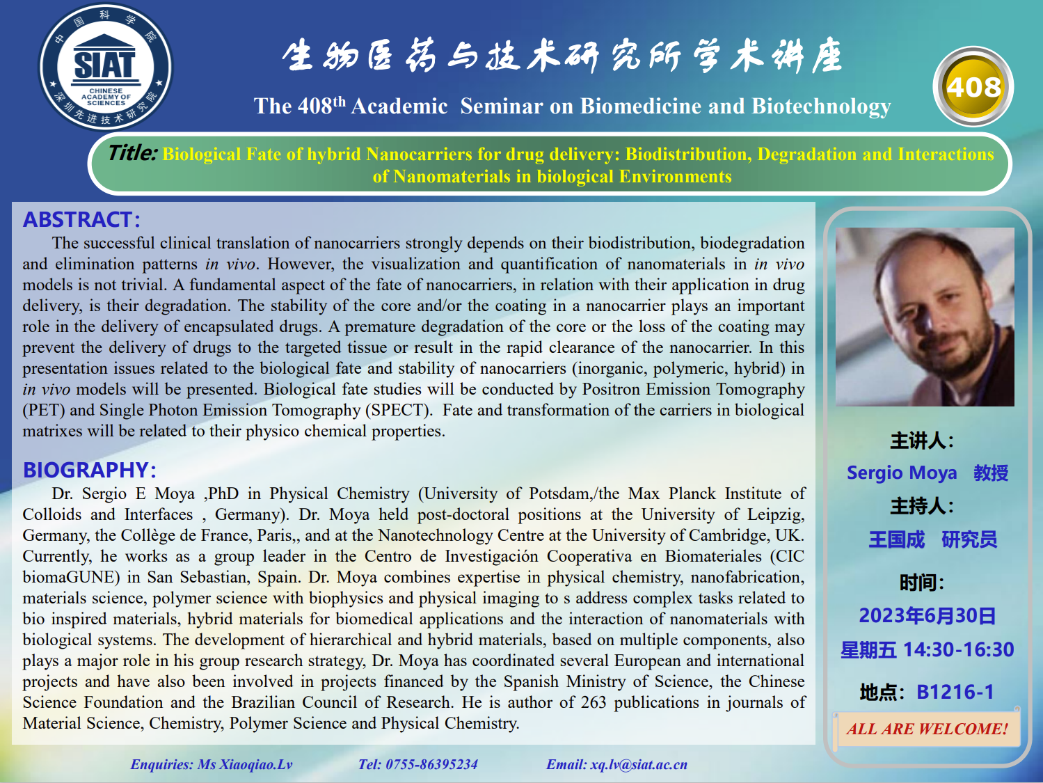 大家好! 医药所第408期学术讲座将于2023年06月30日 星期五 14:30-16:30 B1216-1会议室举行。本次讲座邀请了来自西班牙CIC biomaGUNE,Sergio Moya 教授带来“Biological Fate of hybrid Nanocarriers for drug delivery: Biodistribution, Degradation and Interactions of Nanomaterials in biological Environments ”的报告。届时,王国成 研究员 将主持讲座。