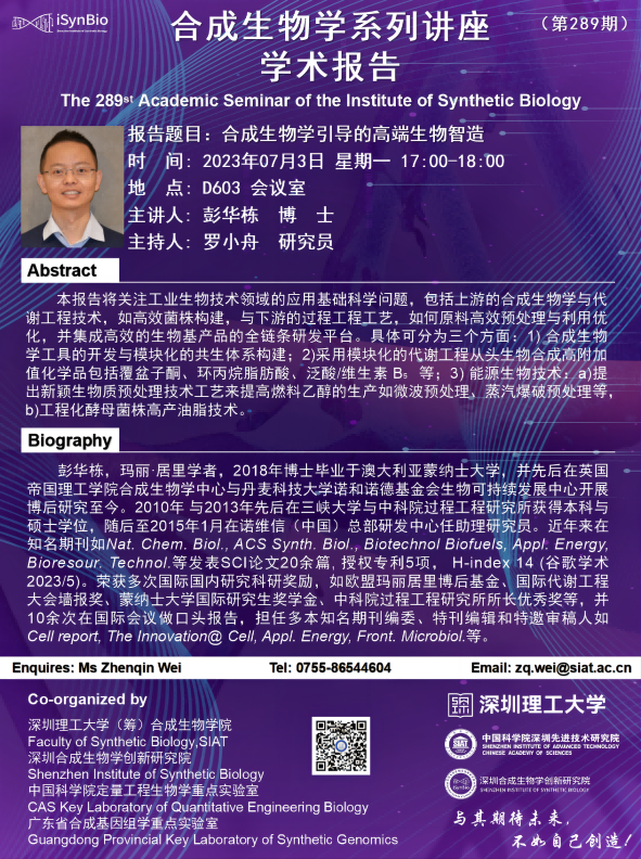 各位老师、同学、同事好: 合成所/合成生物学院第 289期 学术讲座将于 7月3日(星期一)17:00-18:00 在 D603会议室 举行。 本次讲座邀请了 丹麦科技大学 彭华栋博士 带来题为 合成生物学引导的高端生物智造 的报告。 届时,罗小舟 研究员 将主持讲座。诚挚邀请大家准时参加、学习与交流! 讲座具体信息如下: