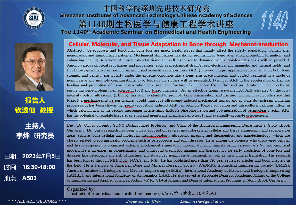本次讲座邀请了 纽约州立大学 钦逸仙 教授 带来题为“Cellular, Molecular, and Tissue Adaptation in Bone through Mechanotransduction”的报告。