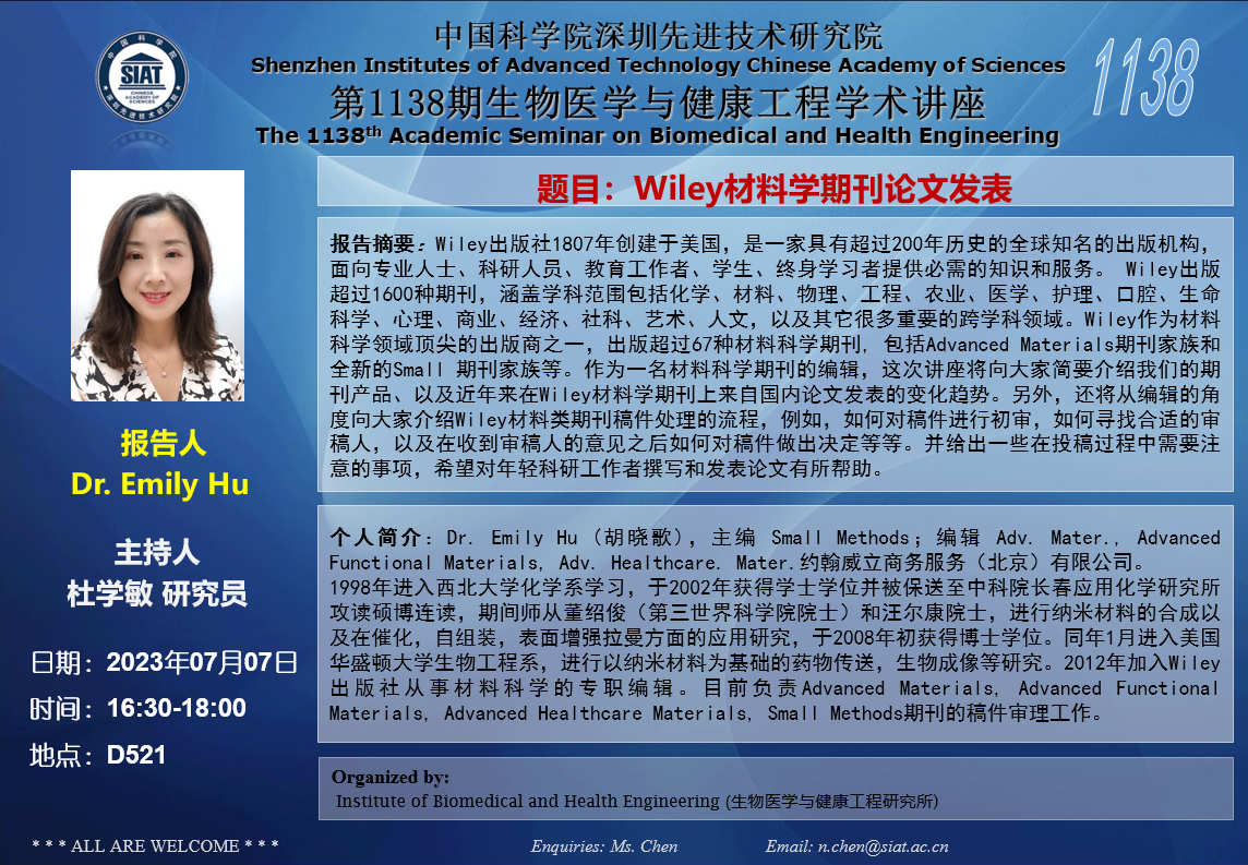 本次讲座邀请了 Wiley出版社 Dr. Emily Hu 带来题为“Wiley材料学期刊论文发表”的报告。
