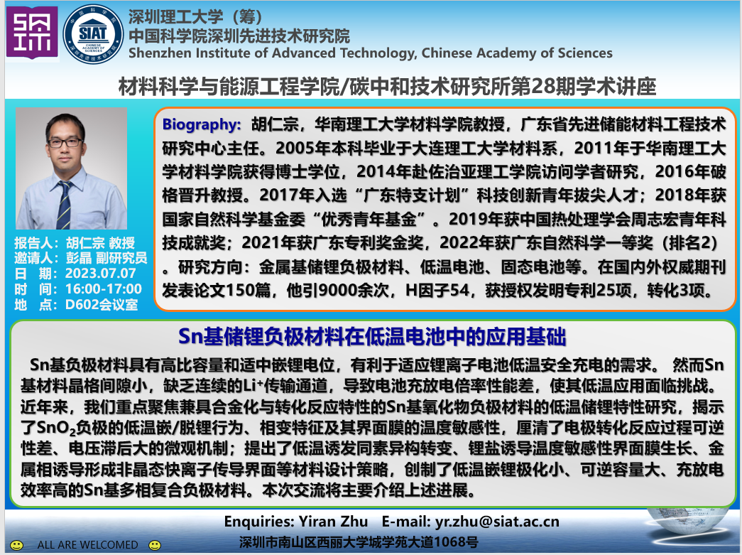 材料科学与能源工程学院/碳中和技术研究所第28期学术讲座将于7月7日(周五)16:00-17:00在D602会议室召开。本次讲座特邀华南理工大学的胡仁宗 教授作题为《Sn基储锂负极材料在低温电池中的应用基础》的学术报告。