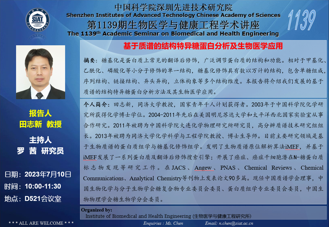 本次讲座邀请了 同济大学 田志新 教授 带来题为“基于质谱的结构特异糖蛋白分析及生物医学应用”的报告。