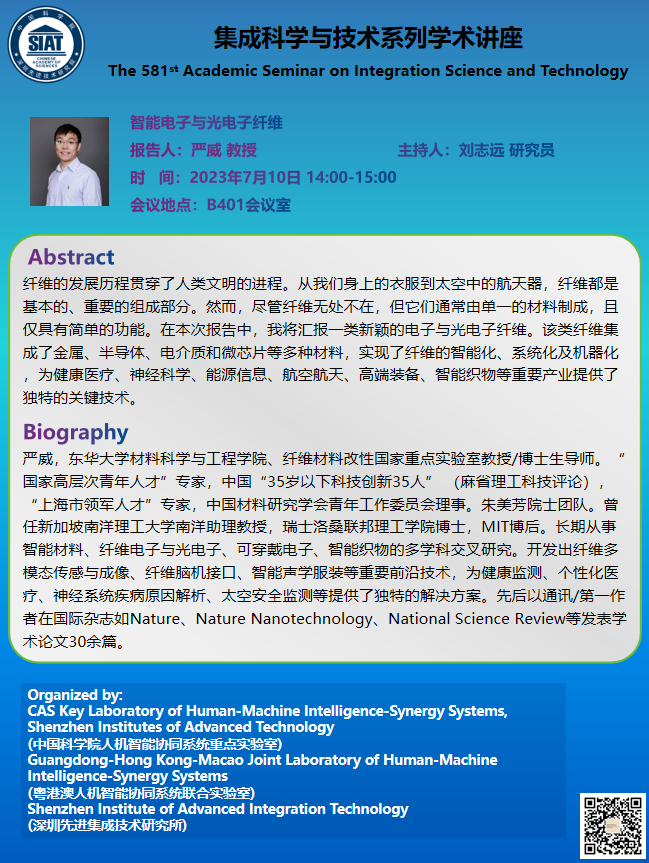 集成所第581期集成科学与技术系列学术讲座将于2023年7月10日(周一)下午14:00-15:00于B401会议室召开,本次讲座特邀东华大学的严威 教授作题为《智能电子与光电子纤维》的学术报告。