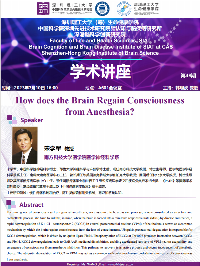 由南方科技大学医学院医学神经科学系,宋学军教授,带来题为“How does the Brain Regain Consciousness from Anesthesia?”专题讲座。