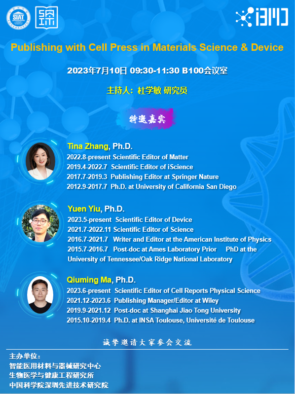 医工所智能医用材料与器械研究中心-Cell Press编辑见面会将于 2023年7月10日(周一) 09:30-11:30 在B100会议室举行。