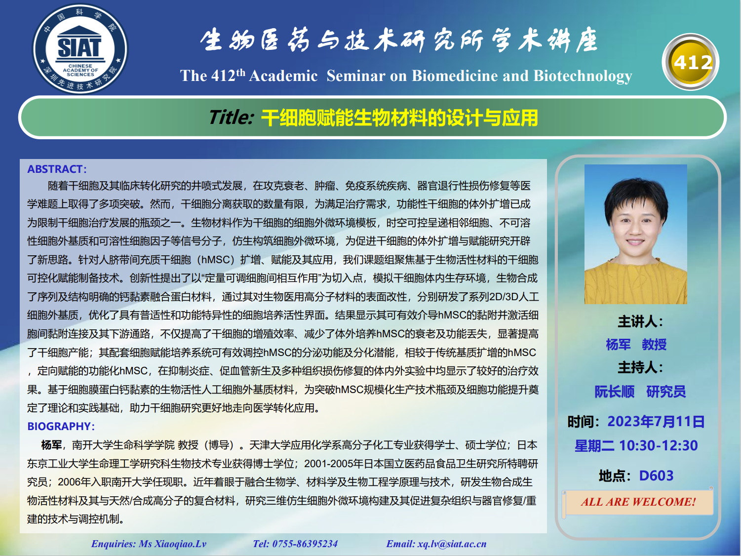 大家好! 医药所第412期学术讲座将于2023年07月11日 星期二 10:30-12:30 D603会议室举行。本次讲座邀请了来自南开大学,杨军 教授带来“干细胞赋能生物材料的设计与应用”的报告。届时,阮长顺 研究员 将主持讲座。