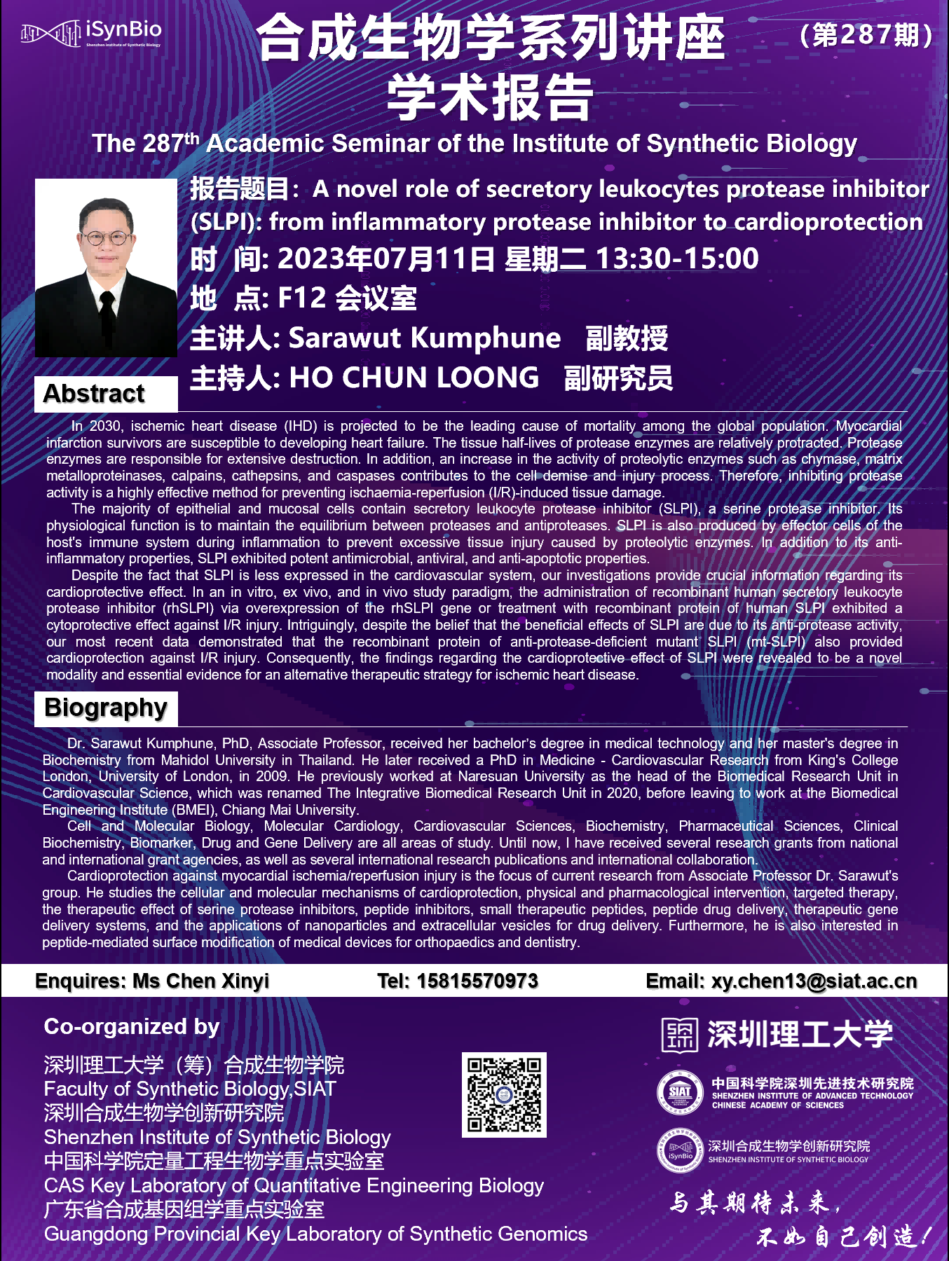本次讲座邀请了 清迈大学 Sarawut Kumphune 副教授 带来题为“A novel role of secretory leukocytes protease inhibitor (SLPI): from inflammatory protease inhibitor to cardioprotection”的报告。