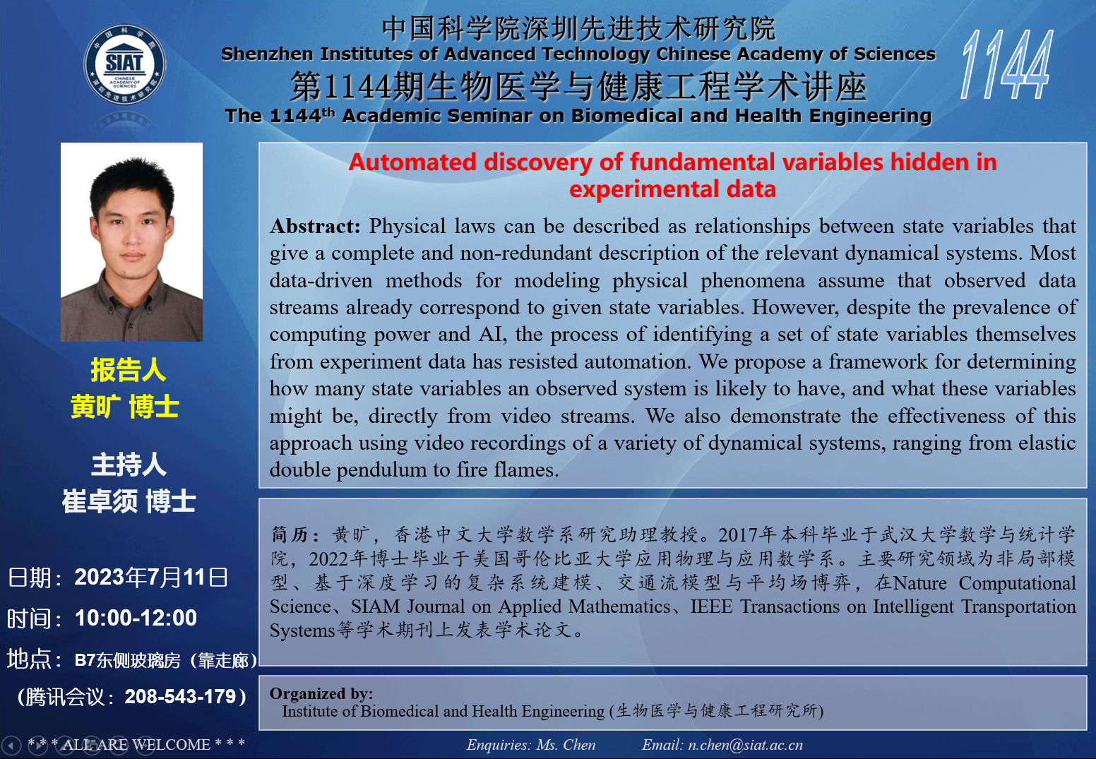 本次讲座邀请了 香港中文大学 黄旷 博士 带来题为“Automated discovery of fundamental variables hidden in experimental data”的报告。