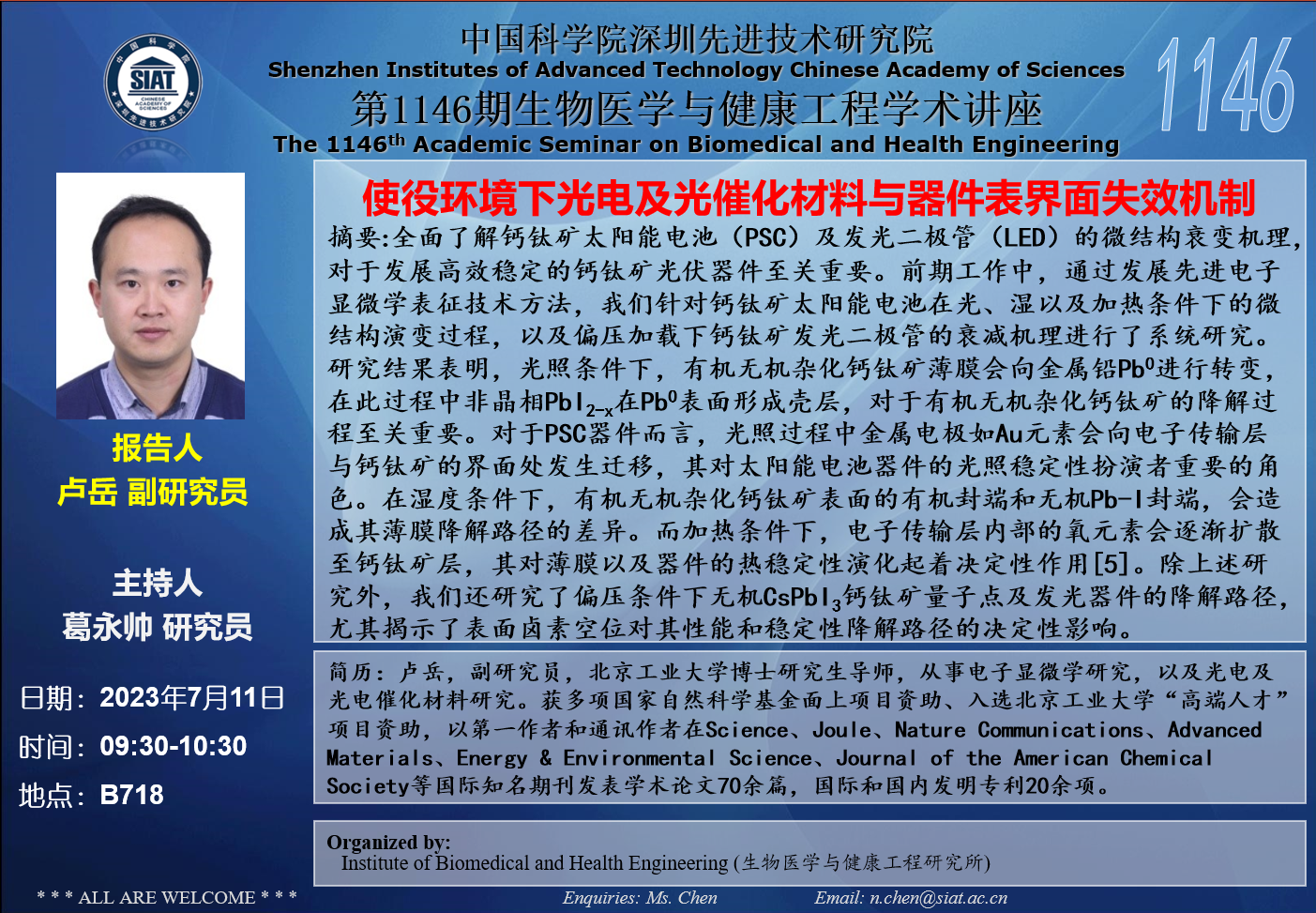本次讲座邀请了 北京工业大学 卢岳 副研究员 带来题为“使役环境下光电及光催化材料与器件表界面失效机制”的报告。
