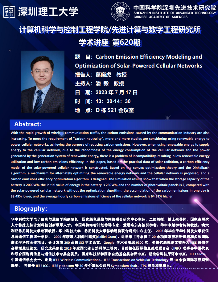 大家好!计算机学院/先进计算与数字工程研究所学术讲座第620期将于7月17日13:30-14:30在D栋521会议室举行,本次讲座将邀请华中科技大学 葛晓虎 教授作题为“Carbon Emission Efficiency Modeling and Optimization of Solar-Powered Cellular Networks”的报告。本次报告将由计算机学院 潘毅 教授主持,诚挚邀请大家参加、学习和交流!