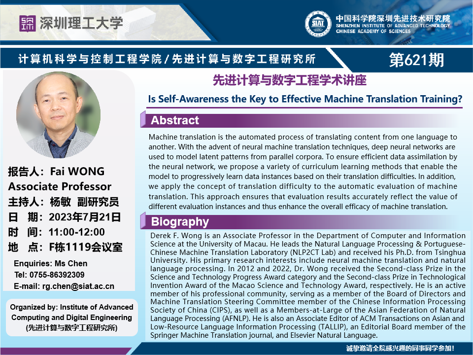 大家好!计算机学院/先进计算与数字工程研究所学术讲座第621期将于7月21日11:00-12:00在F1119会议室举行,本次讲座将邀请澳门大学 黄辉 副教授作题为“Is Self-Awareness the Key to Effective Machine Translation Training?”的报告。本次报告将由数字所 杨敏 副研究员主持,诚挚邀请大家参加、学习和交流!