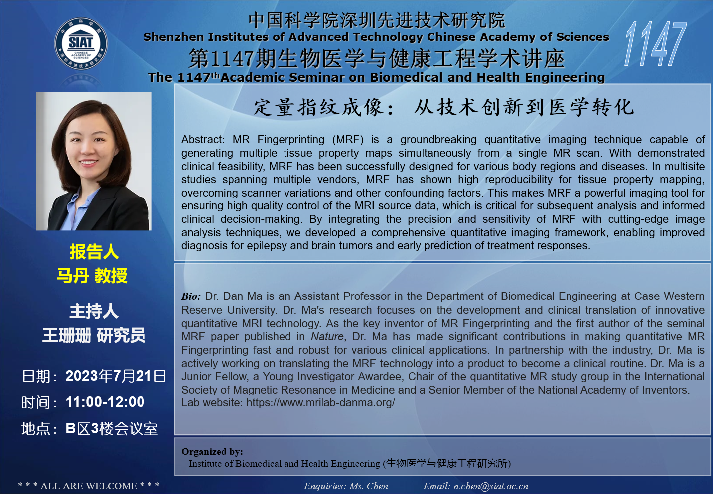 医工所第1147期学术讲座将于 2023年7月21日(周五) 11:00-12:00 在B区3楼会议室举行。