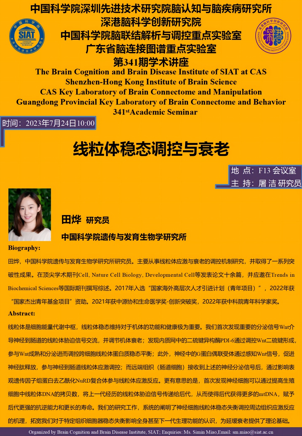 脑认知与脑疾病研究所将于2023年7月24日10:00,举办第341期学术讲座。
