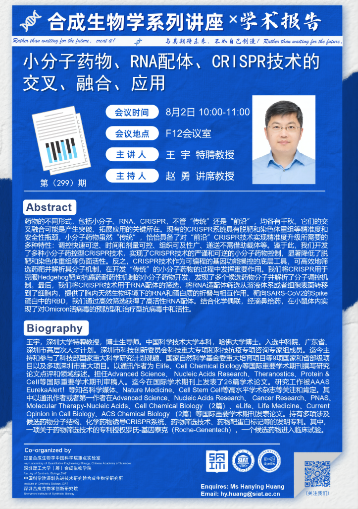 【2023年8月2日 合成所/合成生物学院】小分子药物、RNA配体、CRISPR技术的交叉、融合、应用