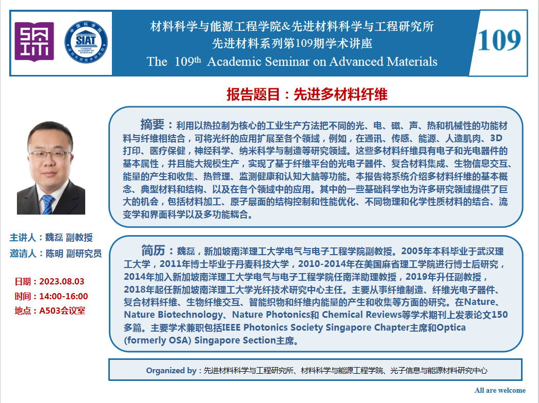 材料科学与能源工程学院 & 先进材料科学与工程研究所“先进材料系列”第109期学术讲座将于08月03日(周四)14:00-16:00,在A503会议室进行。
