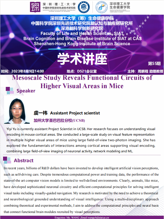 由加州大学圣巴巴拉分校,虞一祎博士,带来题为“Mesoscale Study Reveals Functional Circuits of Higher Visual Areas in Mice”专题讲座。
