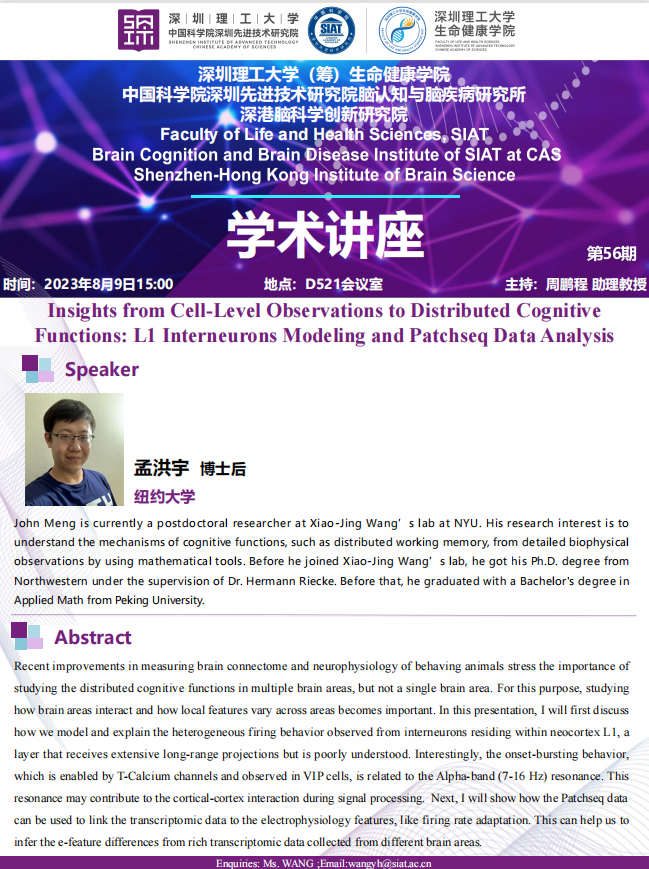 由纽约大学,孟洪宇博士,带来题为“Insights from Cell-Level Observations to Distributed Cognitive Functions: L1 Interneurons Modeling and Patchseq Data Analysis”专题讲座。