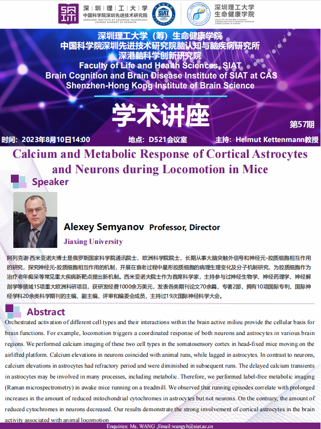 由嘉兴学院,Alexey Semyanov教授,带来题为“Calcium and Metabolic Response of Cortical Astrocytes and Neurons during Locomotion in Mice”专题讲座。