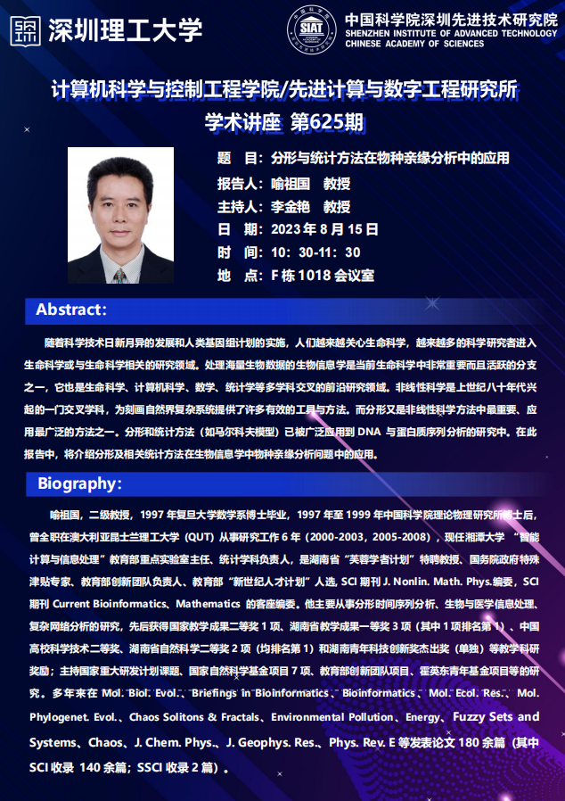 大家好!计算机学院/先进计算与数字工程研究所学术讲座第625期将于8月15日10:30-11:30在F栋1018会议室举行,本次讲座将邀请湘潭大学 喻祖国 教授作题为“分形与统计方法在物种亲缘分析中的应用”的报告。本次报告将由计算机学院 李金艳 教授主持,诚挚邀请大家参加、学习和交流!