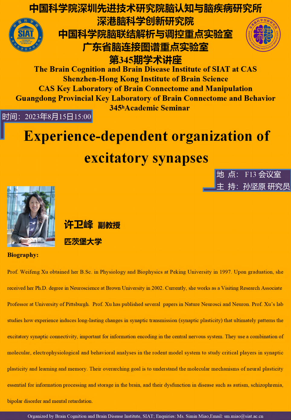 由匹茨堡大学,许卫峰副教授,带来“Experience-dependent organization of excitatory synapses”的专题报告。
