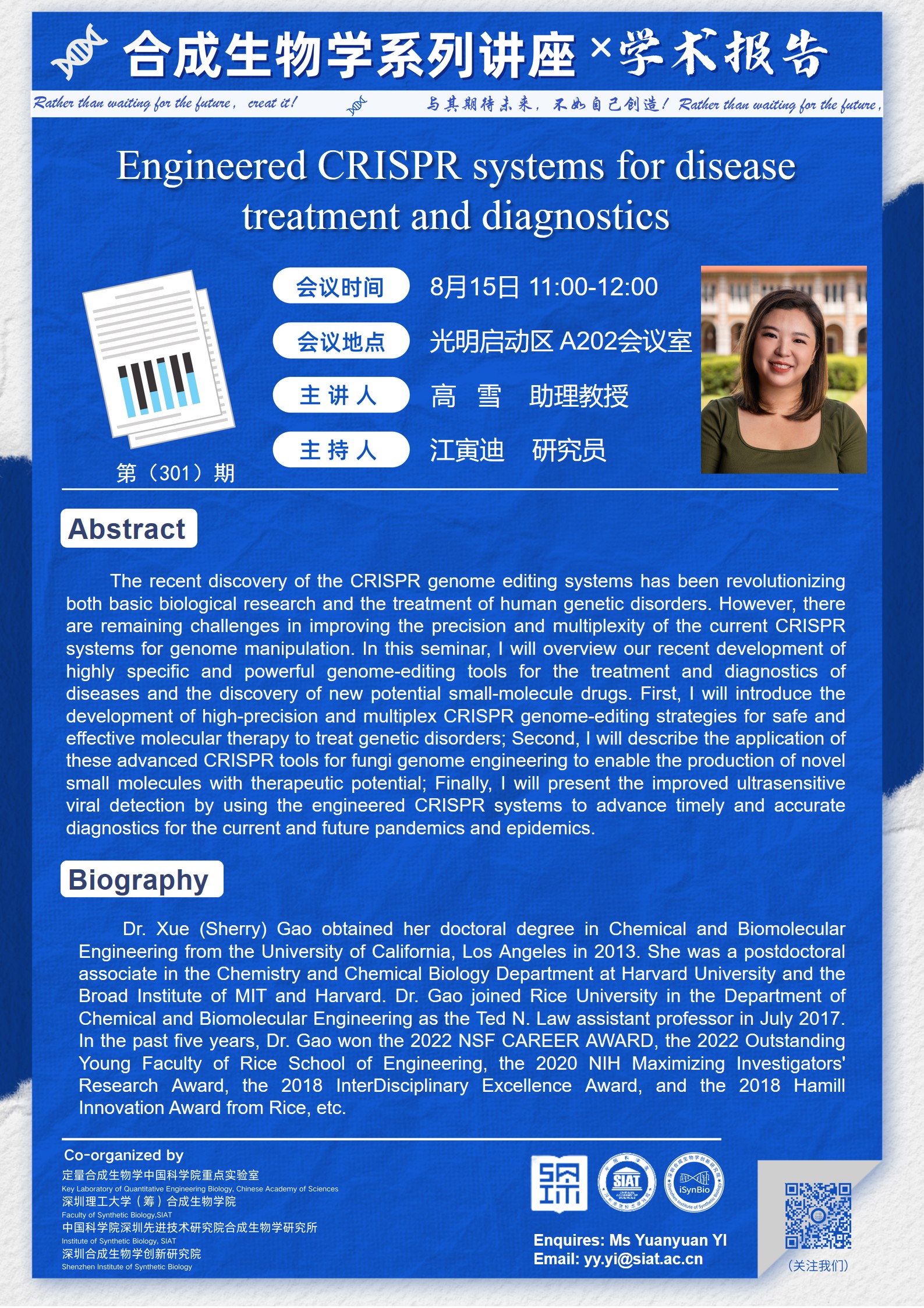 合成所/合成生物学院第301期学术讲座将于 8月15日(星期二)11:00-12:00 在光明科学城启动区A202会议室举行。