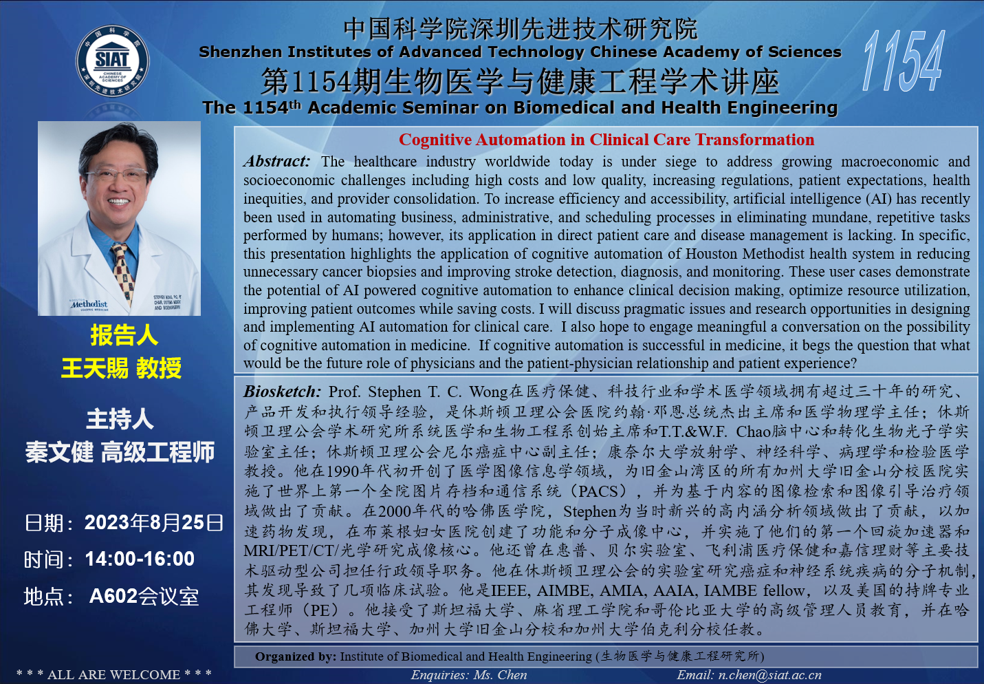 医工所第1154期学术讲座将于 2023年8月25日(周五) 14:00-16:00 在A602会议室举行。