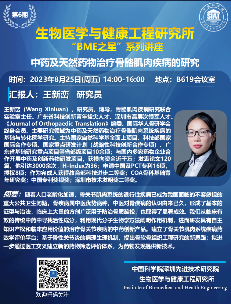 届时,王新峦 研究员将为大家带来题为“中药及天然药物治疗骨骼肌肉疾病的研究”的报告。