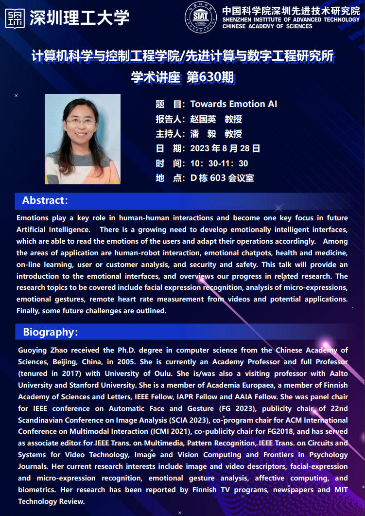 大家好!计算机学院/先进计算与数字工程研究所学术讲座第630期将于8月28日10:30-11:30在D栋603会议室举行,本次讲座将邀请奥卢大学 赵国英 教授作题为“Towards Emotion AI”的报告。本次报告将由计算机学院 潘毅 教授主持,诚挚邀请大家参加、学习和交流!