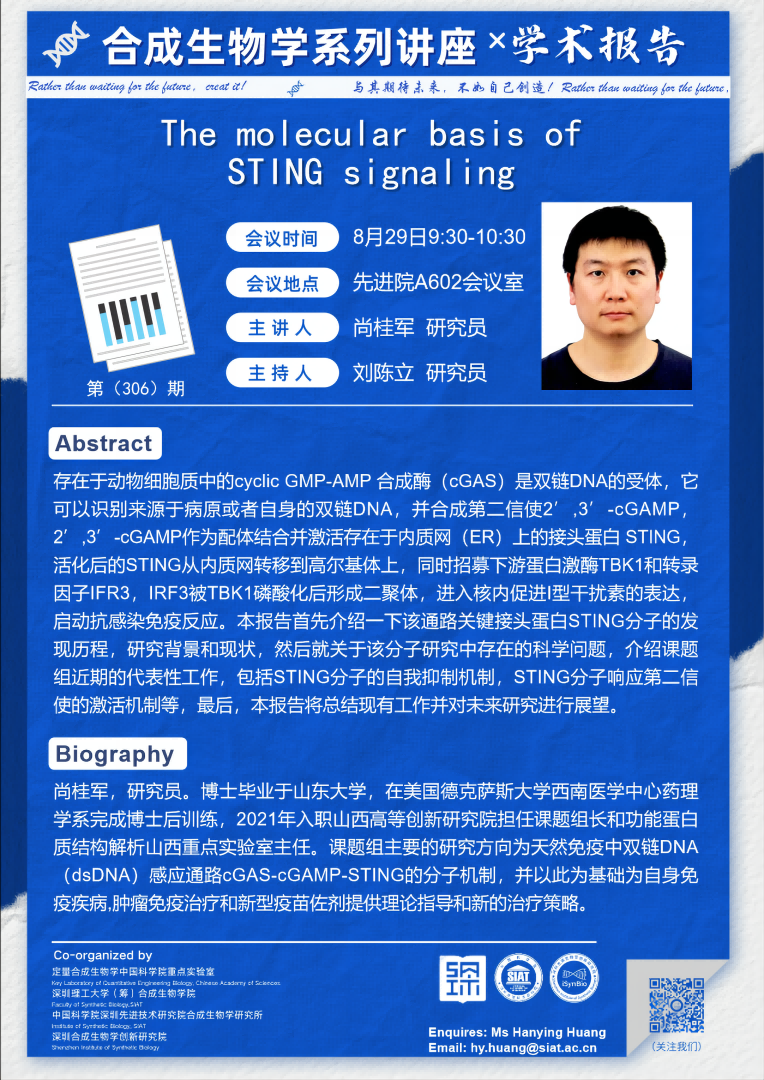 本次讲座邀请了 山西高等创新研究院 尚桂军 研究员 带来题为“The molecular basis of STING signaling”的报告。