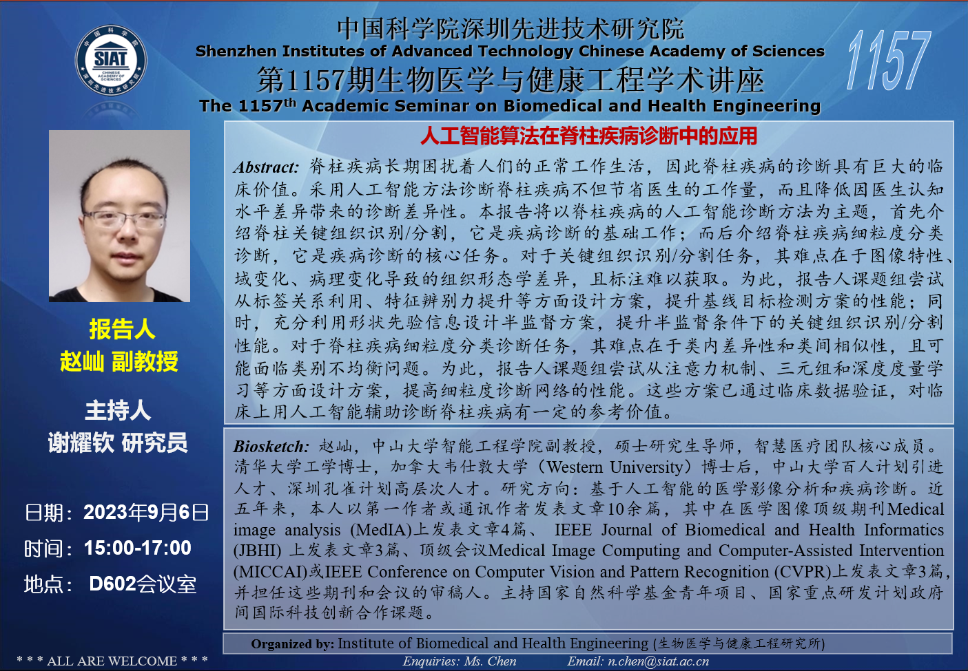 本次讲座邀请了 中山大学智能工程学院 赵屾 副教授 带来题为“人工智能算法在脊柱疾病诊断中的应用”的报告。