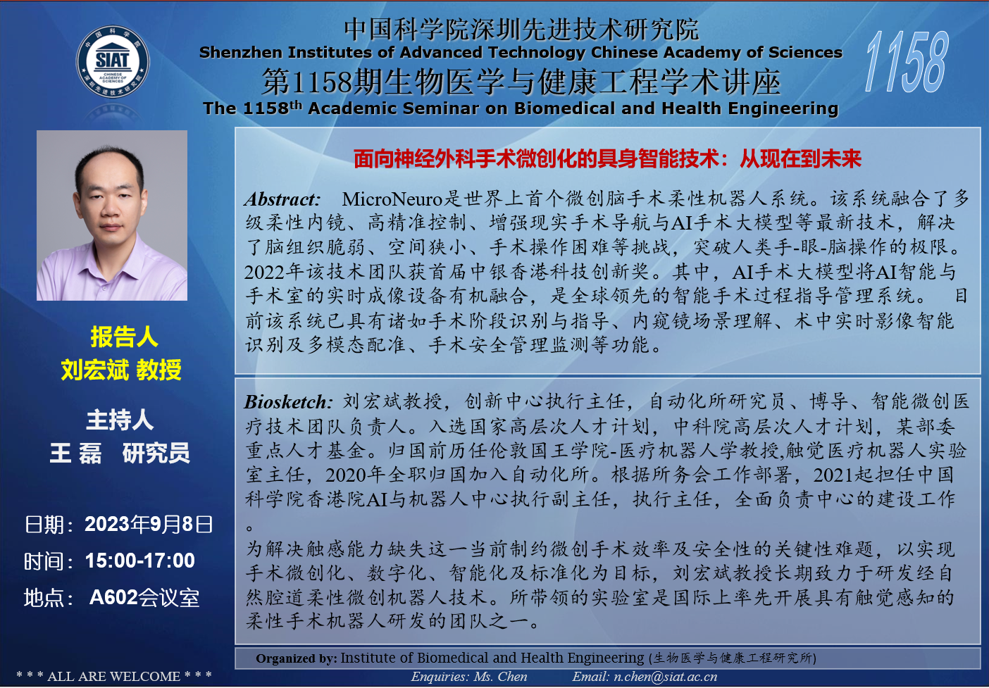 本次讲座邀请了 中国科学院自动化研究所 刘宏斌 教授 带来题为“面向神经外科手术微创化的具身智能技术:从现在到未来”的报告。