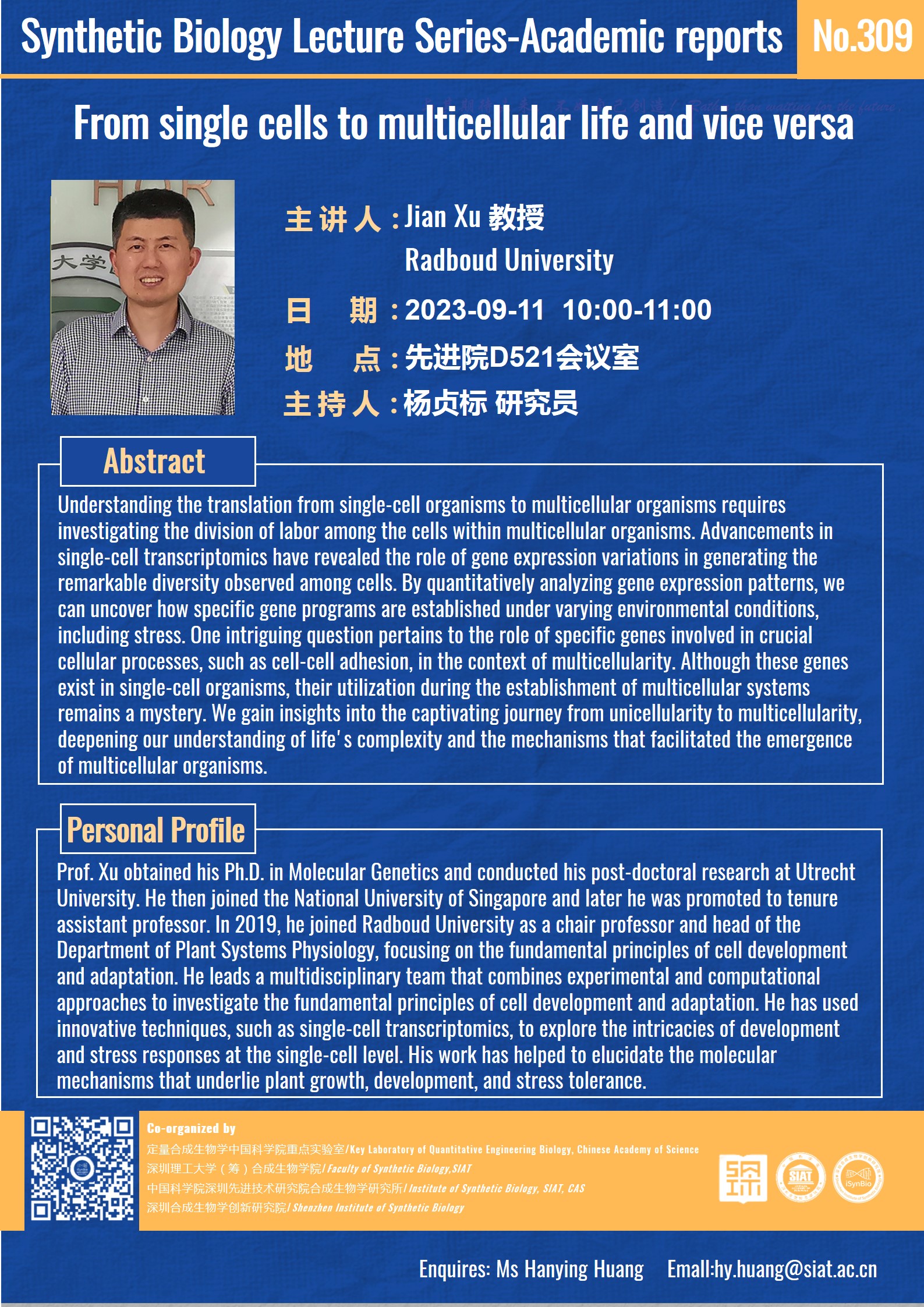 309期讲座邀请了 Radboud University Jian Xu 教授 带来题为“From single cells to multicellular life and vice versa”的报告。