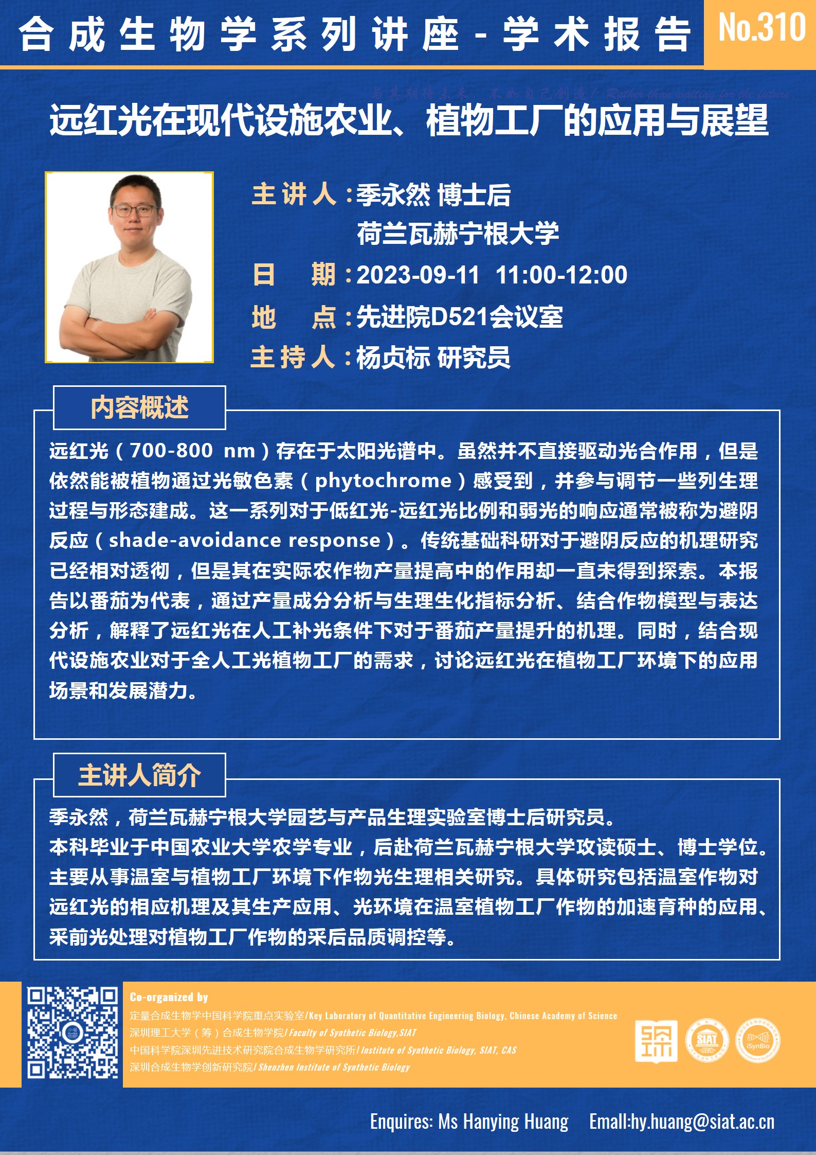 310期讲座邀请了 荷兰瓦赫宁根大学 季永然 博士 带来题为“远红光在现代设施农业、植物工厂的应用与展望”的报告。
