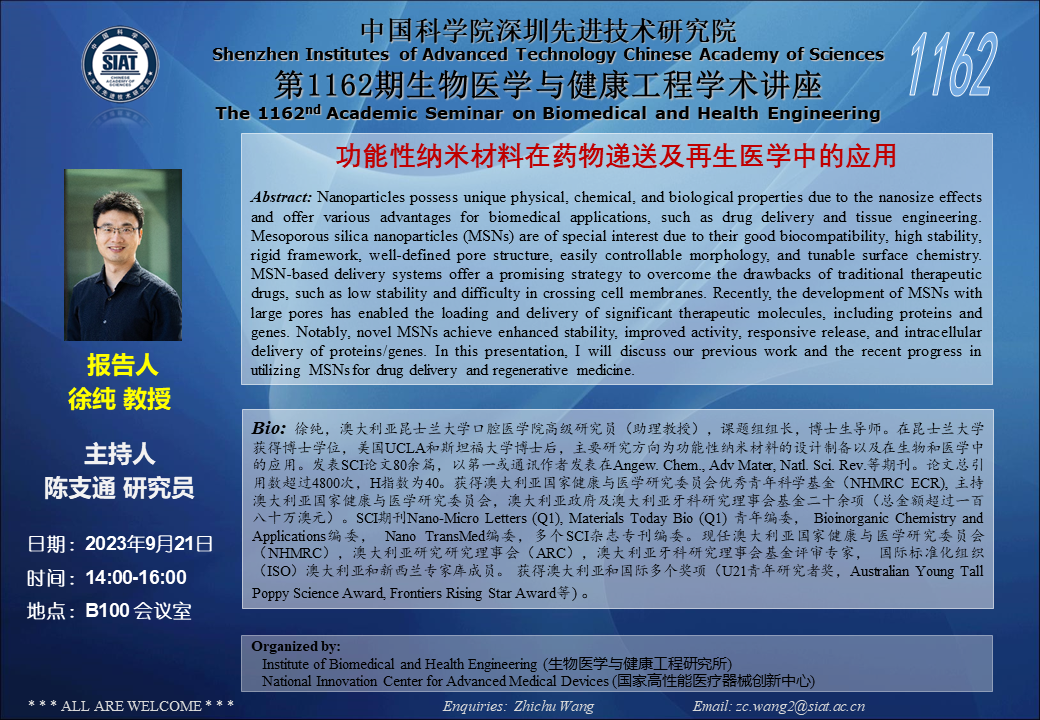 【2023年9月21日 医工所】功能性纳米材料在药物递送及再生医学中的应用