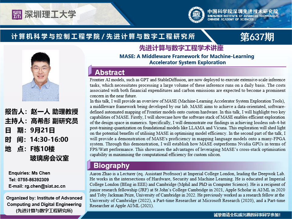 大家好!计算机学院/先进计算与数字工程研究所学术讲座第637期将于9月21日14:30-16:00在F栋10楼西边玻璃房会议室举行,本次讲座将邀请伦敦帝国理工学院 赵一人 助理教授作题为“MASE: A Middleware Framework for Machine-Learning Accelerator System Exploration”的报告。本次报告将由数字所 高希彤 副研究员主持,诚挚邀请大家参加、学习和交流!
