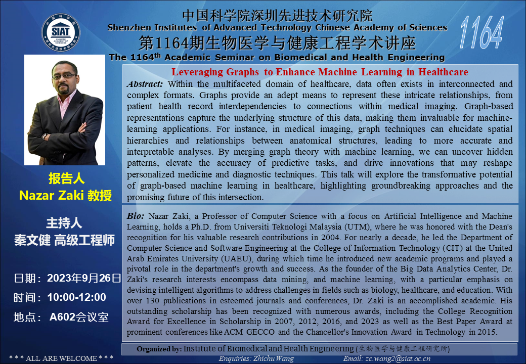 本次讲座邀请了United Arab Emirates University Nazar Zaki 教授带来题为“Leveraging Graphs to Enhance Machine Learning in Healthcare”的报告。