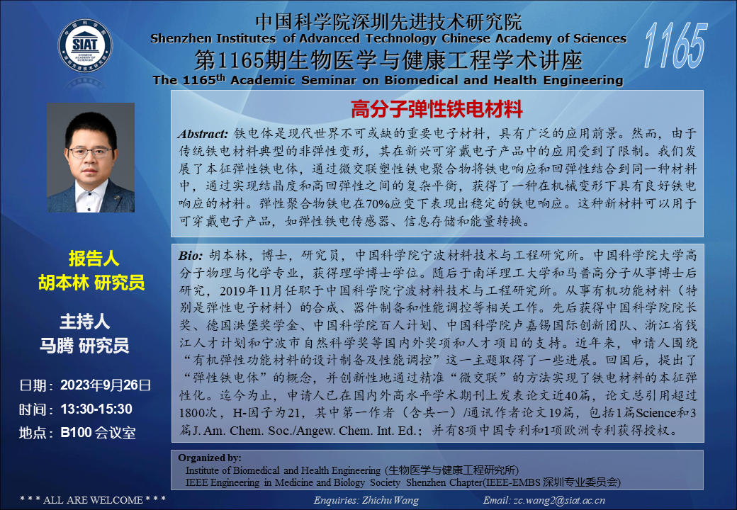 本次讲座邀请了 中国科学院宁波材料技术与工程研究所 胡本林 研究员带来题为“高分子弹性铁电材料”的报告。