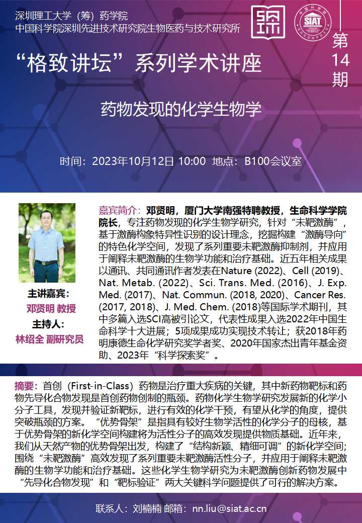 大家好!药学院/医药所“格致讲坛”系列学术讲座第14期将于2023年10月12日(周四)10:00,在先进院B100会议室举行。本次讲座邀请了来自厦门大学的邓贤明 教授带来“药物发现的化学生物学”的报告。届时,林绍全 副研究员将主持讲座。
